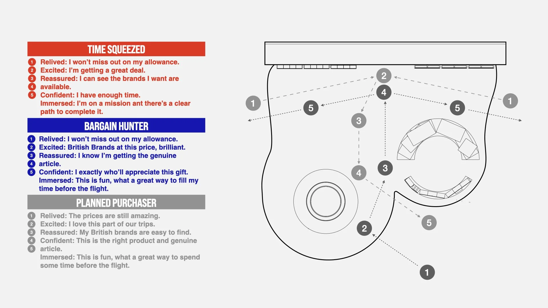 In developing our design approach and the overall layout of the environment, we focused on our target audience — predominantly British travellers abroad. Within this group, we identified three key user types: the Time-Squeezed, the Bargain Hunter, and the Planned Purchaser. Mapping these user types across the environment helped us better understand their behaviours and build a clear hierarchy of touchpoints to guide the design.