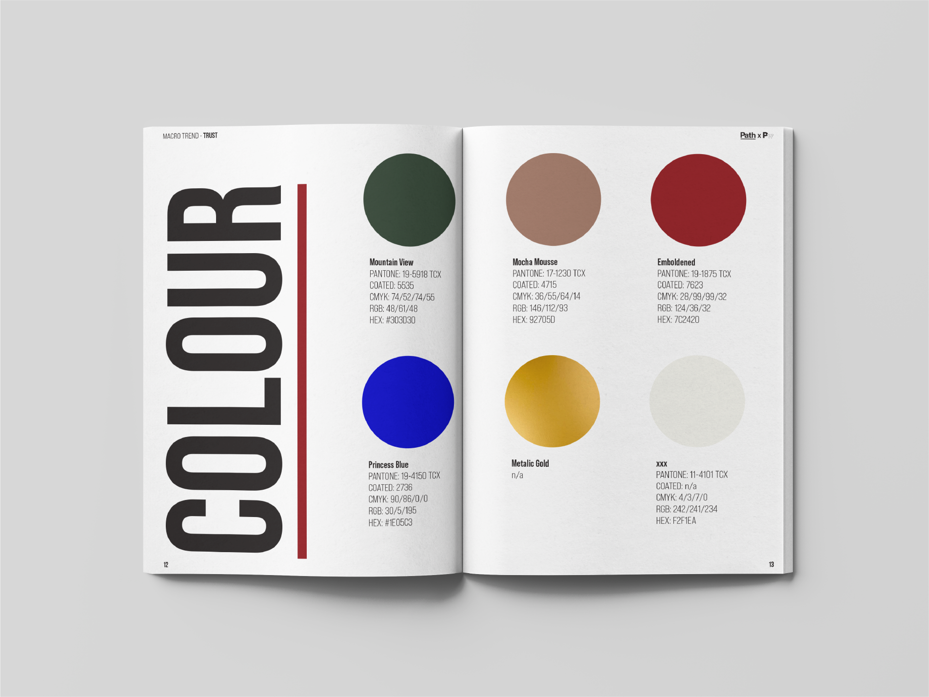 The magazine is structured around three macro trends: Trust, Future, and Planet. Each macro trend is supported by two micro trends, designed to challenge and expand upon the overarching themes.
